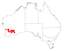It is endemic to an area in the Wheatbelt and the Goldfields regions of Western Australia where it is found on and around low-lying areas and undulating plains growing in sandy or loamy soils.[1]