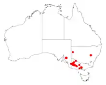 The shrub has a scattered distribution from the Burra Gorge and Bordetown area in South Australia the west through to the Little Desert and Dimboola in the Victoria where it is found on rocky hills as a part of scrub or Eucalyptus woodland communities.[1]