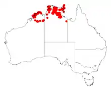 It is found in the Kimberley region of Western Australia[1] and in the Northern Territory from Melville Island in the north , south to Kakadu National Park. Usually it is found among sandstone outcrops and ranges and along rocky watercourses in sandy soils in open Eucalypt or mixed woodland communities sometimes it is associated with Melaleuca nervosa.[2]