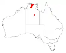 It is endemic to the top end of the Northern Territory where it is chiefly found in Arnhem Land, throughout Kakadu National Park and Nitmiluk National Park where it is often situated on plateaux and in gorges and on slopes growing in sandy soils usually near creeks or streams.[1]