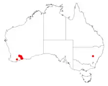 It is native to an area along the south coast in the Goldfields-Esperance and Great Southern regions of Western Australia where it is found on hilltops and ridges growing in gravelly lateritic soils.[1] The shrub is mostly found between Holt Rock and Ravensthorpe in open woodland or mallee communities.[2]