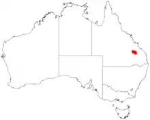 The shrub has a limited distribution on the Isla Gorge National Park area of the Central region of Queensland where it is found on sandstone plateaus growing in skeletal sandy soils among Eucalyptus woodland communities.[2] Its range extends through the central highlands from around Taroom. Originally the species was thought to exist in only three populations within the Isla Gorge National Park but other plants have been found south of Isla Gorge beyond the border of the Wondekai Nature Reserve with more plants located in the Palmgrove National Park.[1]