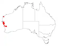 It is native to an area in the Mid West and northern Wheatbelt region of Western Australia where it is found amongst dense shrubland on sandplains, or swales or sand dunes growing in sandy[1] It has a disjunct distribution between Carnamah and Watheroo in the south to near Buntine Rock in the east a little to the north of the Murchison River.[2]