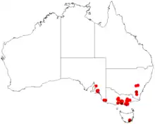 It is native to an area in eastern Victoria from around the from the upper reaches of the Macalister River area near Mount Howitt in the north and down to around Yarram in the south and extending east to around Tabberabbera where it is usually situated in moist forest environments.[2] Although regarded as a rare species, it is commonly cultivated, and has become naturalised in areas outside its original range.[3]