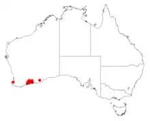 It is native to an area along the coast in the South West and Goldfields-Esperance regions of Western Australia where it grows in gravelly lateritic clay-loam and sandy soils.[2] The bulk of the population is found on the south coast between Mid Mount Barren near Ravensthorpe in the west and Young River in the east[1] with an isolated population found on the west coast around Busselton.[2]