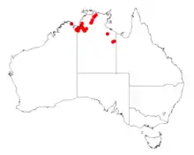 It is native to the Northern Territory and the Kimberley region of Western Australia where they are found amongst sandstone outcrops[1] and on sandstone hills. The western end of the plants native range is to the east of Kununurra, it then has a scattered distribution through the top end of the Northern Territory including the Keep River National Park and around Mount Brockman in the Kakadu National Park.[2]