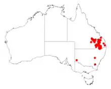 It is native to an area to southern Queensland extending into northern New South Wales particularly in the Yetman district close to the border of Queensland on the north west slopes of New South Wales. Although reasonably rae in New south Wales it is quite common in Queensland. It is mostly located in dry Eucalyptus sclerophyll woodland communities growing in sandy to sandy-loam soils sandy to sandy-loam soils or among dry ranges in clay-loam to loamy soils.[1]