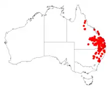 It is native to an area in southern Queensland around Port Clinton in the north extending into New South Wales to around Glenbrook and extending to about 500 km (310 mi) inland.[2] It is usually a part of dry sclerophyll forest and woodland communities growing well in sandy soils. In New South Wales it is extends north from around Glenbrook and as far west as Gilgandra.[1]