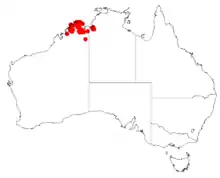 It is native to an area in the Northern Territory and the Kimberley region of Western Australia where it is found on rocky escarpments and stony creek beds growing in skeletal soils over sandstone.[1]