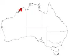 It is native to an area in the Kimberely, region of Western Australia where it is commonly situated in areas of sandstone or dolerite growing in skeletal sandy soils.[2] It is mostly found on the Bonaparte Archipelago and parts of the nearby mainland and also off-shore including on Heywood Island and Bigge Island as a part of Eucalyptus woodland communities.[3]