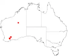 It is native to an area in the Wheatbelt and Goldfields-Esperance regions of Western Australia where it is commonly situated along drainage lines or in flat areas growing in clay-sand, sandy or gravelly soils[2] as a part of open mallee over low scrub communities. There are only nine remaining populations or fifteen subpopulations of the plant remaining with an estimated 5,483 individuals remaining which are found in the Shire of Lake Grace and Shire of Yilgarn where over 75% of the native vegetation has been cleared.[1]