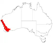 It is native to an area in the Great Southern, Wheatbelt and Mid West regions of Western Australia where it is commonly situated on sand ridges and sand plains growing in gravelly sandy, loamy or clay soils often around laterite.[1] The species is found from around Shark Bay in the north west to around Cranbrook and Wagin in the south east.[2]