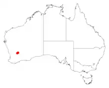 It is native to a small area in the Wheatbelt and Goldfields-Esperance regions of Western Australia where it is commonly situated on low granitic breakaways growing in gritty loam or sandy soils.[3] The range of the plant is only about 17 km (11 mi) containing three populations that is adjacent to the Chiddarcooping Nature Reserve with the Westonia and Nungarin Shires as a part of shrubland or open woodland communities containing species including Acacia andrewsii, Daviesia nematophylla, Eucalyptus yilgarnensis, Melaleuca uncinata and Austrodanthania setacea.[2]