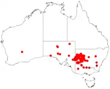 Acacia loderi is found in inland southeastern Australia, mainly in far western New South Wales, from White Cliffs in the north of the tip of northwestern Victoria in the south, east to Hillston and west through the Darling River basin and Broken Hill into eastern South Australia, growing in colonized brown or red soils in mostly flat country.[3] It forms a dominant component of Acacia loderi shrubland, where it is found with such trees as black oak (Casuarina pauper), inland rosewood (Alectryon oleifolius) and leopardwood (Flindersia maculosa), and an understory of chenopods and grasses.[5]