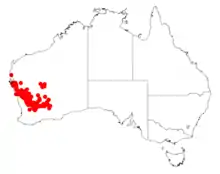 It is native to an area in the Mid West, Wheatbelt and Goldfields-Esperance regions of Western Australia where it is usually situated on low rises and sandplains growing in gravelly, sandy or clay loam soils[1] as a part of shrubland communities. The range of the plant extends from Hamelin Pool Marine Nature Reserve in the north west down to around Narembeen and Boorabbin in the south east with other smaller populations found near Albion Downs and Comet Vale further to the east.[2]