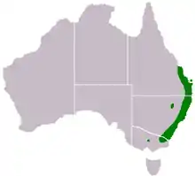 In the Australian state of Victoria it is listed as being an endangered species,[8] however it is a common species through much of the rest of its range.[4] The tree has a lifespan of more than 30 years.[9] It grows approximately 1 m per year.[10] It is frost tolerant down to −7 °C[11] (about 19 °F), but it is not drought tolerant, so irrigation may be necessary in some growing areas.[6] In its natural range, it tends to grow in places with an average maximum temperature of about 25 °C, but it also exists in a range of 22–32 °C avg. max. temp.[12] It tends to grow primarily in areas near the coast averaging 1200–1600 mm/year of rainfall, but overall it is found to some extent in an areas ranging 600–2000 mm/year of rainfall.[12]