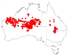 Acacia maitlandii is found in northern regions of all mainland states of Australia, except Victoria,[3] and is not considered to be threatened with extinction.[2] The favoured soil type is red sand, or stony ground, the habitat is sandy or stony plains, and on hills.[2]
