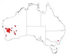 It is native to an area in the Mid West and Goldfields-Esperance regions of Western Australia where it is commonly situated along the margins of marshes and saline lakes and on flats growing in clay or loamy soils[1] as a part of open scrubland communities. It has a scattered distribution with the bulk of the population found between Twin Peaks, Cue, Perenjori and Youanmi with outlying populations found near Kalgoorlie.[2]