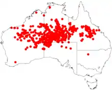 It is native to southern and central parts of the Northern Territory,[6] the north western corner of South Australia,[2] central Queensland[1] and the Kimberley , Pilbara and Goldfields regions of Western Australia where it is found on dunes and sand plains growing in shallow stony or red sandy soils often around laterite.[7] It is usually found as part of open Eucalypt woodland or spinifex communities.[3]