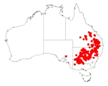 The range of the plant extends from around Clermont in south eastern Queensland in the north down to around Stanthorpe in the south east and throughout central New South Wales into the northern parts of Victoria as far south as Mildura and Kerang as a part of mixed open woodland communities growing in loam, clay and sandy soils.[1] It dominates the endangered Acacia melvillei shrubland in the Riverina and Murray-Darling Depression bioregions in New South Wales where it occurs in pure stands or along with less abundant tall shrubs or trees including Acacia loderi, Alectryon oleifolius, Casuarina pauper and Myoporum platycarpum. The open canopy is followed by a scattered layer of mid-stratum shrubs then by a highly variable but sometimes sparse ground layer of grasses.[4]
