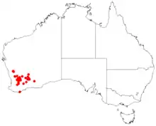 It is native to Wheatbelt, Great Southern and Goldfields-Esperance regions of Western Australia from around Koorda in the north to Coolgardie in the east and Narrogin in the west where it is found in low-lying areas, on hillsides and sandplains growing in rocky sandy soils often around granite outcrops[2] where it is a part of shrubland communities.[3]