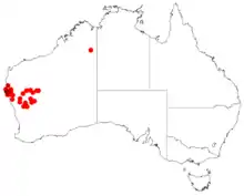 It is native to an area in the Mid West and Goldfields-Esperance regions of Western Australia where it is commonly situated on floodplains and stony plains growing in sandy, loamy and clay loam soils.[1] The bulk of the population is found around Shark Bay but the range extends to the east as far as Mount Magnet in the north east and Belele Station in the south east where it is commonly found as a part of Acacia scrubland communities or with species of Atriplex or Halosarcia.[2]