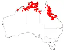 It has a scattered distribution and is native to an area in the Northern Territory, the Kimberley region of Western Australia,[3] and northern Queensland where it is commonly situated on rocky or stony slopes growing in alluvium or over sandstone or soils composed of laterite in drier areas it is usually found as a part of open woodland communities. The range of the plant extends from around Derby in the west across the top end of the Northern Territory and to around Cape Melville in North Queensland in the east and as far south as Clermont.[4]