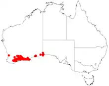 It is native to an area in the Great Southern and Goldfields-Esperance regions of Western Australia from around Gnowangerup in west through to the South Australian border in the east where it is found on sand dunes, undulating plains, depressions and margins of salt lakes where it grows in sandy, calcareous clay, gravelly to loamy soils.[2]