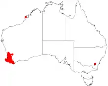 It is native to an area in the Great Southern, South West and Peel regions of Western Australia where it grows in gravelly clay or sandy lateritic soils.[1] It occurs in a block as far north as Mogumber and along the coast south to Cape Naturaliste then east along the coast as far as Albany. Some outlying populations are found in Tammin, Katanning and Mount Barker. It is often found near watercourses or as a part of Eucalyptus woodland or forest communities.[4]