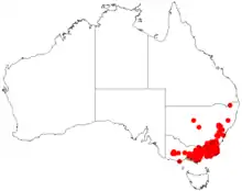 It is native south eastern New South Wales, the Australian Capital Territory,[2] and Victoria in eastern Australia. In New South Wales it is found in tableland areas of the Great Dividing Range that are south of the Goulburn River valley where it is found growing in soils derived from the surrounding sandstone as a part of moist or dry sclerophyll forest and woodland communities.[1] It is found in central and eastern Victoria where its range extends from the Grampians to areas east of Melbourne where it is commonly situated in montane woodlands and forests at an altitude of 500 to 1,700 m (1,600 to 5,600 ft).[2]