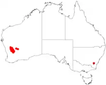 It is native to an area in the Wheatbelt and Goldfields-Esperance regions of Western Australia where it is commonly found on flat areas growing in sandy loam or clay or loamy soils.[1] The range of the shrub is limited to an area between Paynes Find in the north to Wubin in the south to around Kununoppin in the east with a population also found around Lake Barlee.[2]