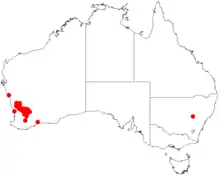 It is native to an area in the Mid West and Wheatbelt regions of Western Australia where it is found on undulating plains, low hills and lateritic rises growing in gravelly clay, loam or sandy soils.[1] The shrub has a scattered distribution from as far north as Northampton with the bulk of the population being found between Watheroo extending south to around Muntadgin mostly as a part of open Eucalyptus woodland communities.[2]