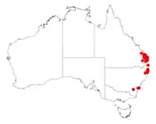 It is found in parts of north eastern New South Wales from around Bellingen and Coff Harbour in the south extending northward into south eastern Queensland. It is found in a variety of habitat growing in gravelly, clay and sandy to loamy soils as a part of wet sclerophyll forest and rainforest communities.[1] Its range extends from around Maryborough in the north down to around Stanmore in the south where it is situated in coastal areas with a high rainfall and low altitudes.[2]