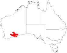 It is native to an area in the eastern Wheatbelt and Goldfields-Esperance regions of Western Australia where it is commonly situated on low rocky hills and undulating plains growing in rocky clay or sandy or stony loam soils.[1] It has a scattered distribution from around Coolgardie in the north west to around the Frank Hann National Park in the south and east out to around Fraser Range as a part of Eucalyptus woodland or Mallee scrubland communities.[2]