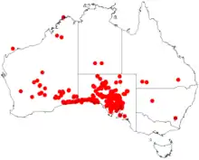 It is endemic to arid parts of central Australia, it occurs on limestone plains in southern Australia from Paynes Find in Western Australia eastwards into South Australia. There is also an anomalous specimen at Cooper Creek in Queensland. A weeping form of the species that grows at Roxby Downs, South Australia bears the common name water myall.[2] It is commonly situated on low limestone rises, saline or clay flats where it grows in calcareous sandy loam or clay soils.[1]