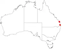 It is endemic to Queensland from around the Burrum Range in the north to around 30 km (19 mi) south east of Brisbane where it is found along small streams and creeks growing in sandy or clay loam soils.[1]