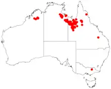 an area in the Kimberley region of Western Australia,[1][3] and north western Queensland and the Northern Territory.[3] It grows on stony and lateritic soils and on sandstone on plains and rocky ridges.[1] The soils are often shallow and are stony and sandy and are found in open woodland communities or with species of Triodia.[3]