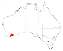 It is native to an area in the Great Southern and Goldfields-Esperance regions of Western Australia where it is commonly situated on rocky cliffs, along watercourses, on sandplains and on coastal cliffs and dunes growing in sandy or loamy or clay soils often over or around limestone, laterite or quartzite.[1] Its distribution extends from around Beaufort Inlet in the west to around Munglinup in the east, the bulk of the population being found in Fitzgerald River National Park with an isolated population between Lake King and Newdegate to the north west.[2]