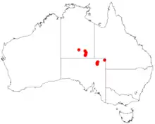 It is endemic to the Sturt Stony Desert[3] in north eastern South Australia from around the Mount Gason bore along the Birdsville Track in the south to around Andado Station in the south eastern Northern Territory in the north where it is found on gibber or sand plains growing in stony sandy clay soils in scrubland communities along with species of Atriplex and Sclerolaena.[1] In the Northern territory there are three main populations containing several hundred individual plants. In South Australia there are several populations known also totalling several hundred plants.[2]