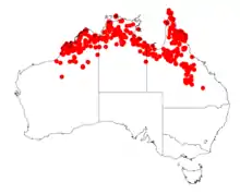 It occurs on red sand soils in pindan, and on dunes, hills and rocky outcrops. In Western Australia it is found in the Central Kimberley, Dampierland, Great Sandy Desert, Little Sandy Desert, Northern Kimberley, Ord Victoria Plain, Tanami and Victoria Bonaparte IBRA bioregions.[1]