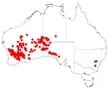 It has a scattered distribution through an area in the northern and eastern Wheatbelt, Pilbara and Goldfields-Esperance regions of Western Australia where it grows in red sandy, loamy and stony soils.[2] Its range extends into western South Australia and the Northern Territory where it is part of open mallee, Eucalyptus woodlands or spinifex communities.[3]