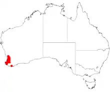 It is native to an area in the South West, Peel and Great Southern regions of Western Australia where it is commonly found growing in lateritic based soils.[1] The range of the plant extends from north of Binddon in the north down to the Whicher Range in the south. A single collection of the species has been made from around Albany where it is usually a part of Eucalyptus marginata or Eucalyptus wandoo forest communities.[2]