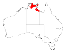 It is native to the top end of the Northern Territory including Maria Island in the Gulf of Carpentaria where it is usually situated on rocky sandstone pavements on plateaux or alluvial flats where it is found growing in sandy or loamy or sandy-silty soils or over around laterite as a part of Eucalyptus woodland or in heathland communities.[1]