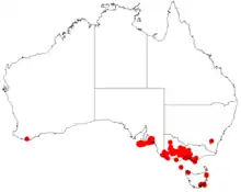 It is endemic to Kangaroo Island, the Fleurieu Peninsula and the Mount Lofty Ranges of South Australia and is also present much of eastern and central of Victoria where it is found in damp areas in and along the margins of swamp and creeks growing in sandy, clay or loamy soils.[1] In Victoria the bulk of the population is found between the Glenelg River in the Grampian Ranges[3] to near Melbourne where it is often a part of open-forest communities in poorly drained soils located well inland from the coast.[2] Specimens have also been collected from Tasmania from King Island and near Launceston.[3]