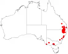 It is found in north eastern New South Wales from around Uralla in the south stretching north into south-eastern Queensland. It is often a part of dry sclerophyll forest and woodland communities and grows in sandy and skeletal soils over and around granite.[1]
