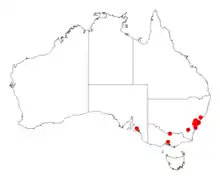 Endemic to New South Wales, Acacia pubescens is restricted to the Sydney Basin, where it is found in scattered populations from Bardwell Valley to Oakdale and Mountain Lagoon. Most plants are located around Bankstown, Fairfield and Rookwood in southwestern Sydney, and Pitt Town in the city's northwest.[10] Most of its habitat has vanished with the spread of housing in Sydney's suburbs,[5] and it is classified as "Vulnerable".[1] It is found on clay soils and associated plant communities—alluvial- and shale-based soils. It grows in open sclerophyll forest, associated with such species as grey box (Eucalyptus moluccana), broad-leaved ironbark (E. fibrosa), white feather honeymyrtle (Melaleuca decora), and blackthorn (Bursaria spinosa).[3]
