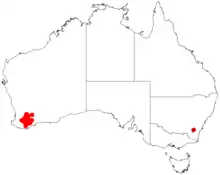 It is native to an area in the Wheatbelt and Great Southern regions of Western Australia from around Corrigin in the north to Mount Barker in the south and is found in damp low-lying areas growing in sandy, clay or loamy soils often with lateritic gravel[1] and is usually a part of open Eucalyptus wandoo woodland communities or in disturbed areas.[2]