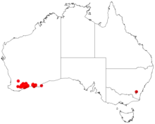 It is native to an area along the southern coast in the Great Southern and Goldfields-Esperance regions of Western Australia.[4] The plant is considered an invasive weed in areas of California where it was used as a fast growing groundcover along freeways. It is particularly problematic in the San Gabriel Valley and Mission Valley.[1]