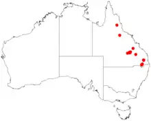 It is a disjunct distribution and is endemic to a small area in the Carnarvon Range in south eastern Queensland and around 300 km (190 mi) further south between Djuan and Karara where it is found in dissected sandstone country in skeletal soils as a part of open woodland communities.[1]