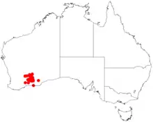 It is native to an area in the Wheatbelt and Goldfields-Esperance regions of Western Australia where it is commonly situated around salt lakes, on undulating plains and in low lying areas growing in gravelly sandy or loam or clay loam soils.[1] It has a scattered distribution from around Yellowdine and Coolgardie in the north down to around Boingaring Rocks in the south as a part of open scrubland or Eucalyptus woodland communities where it is often associated with Melaleuca uncinata.[2]
